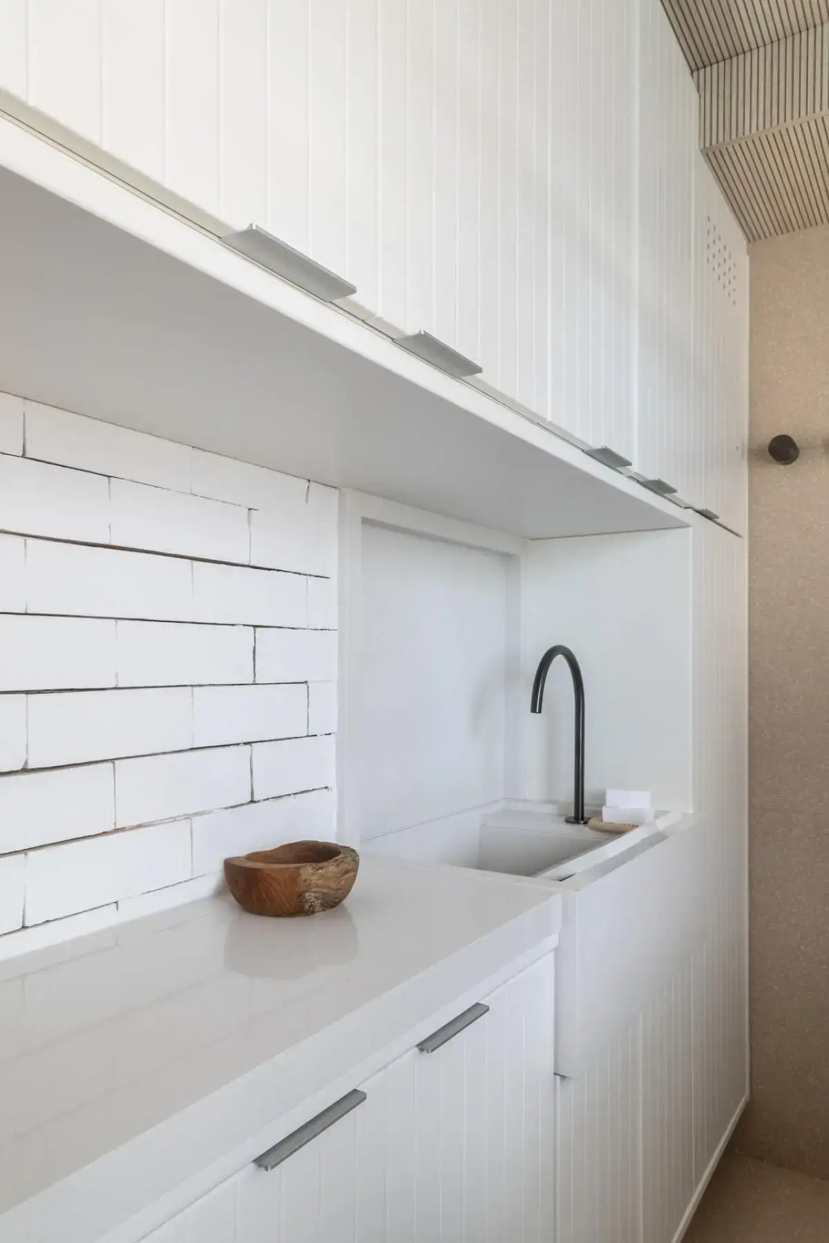 A marcenaria precisava envolver tudo isso, estar amarrada com este conceito e, mais do que estar, precisava apresentar um bom volume de armários para comportar todos os utensílios, incluindo também armazenamento alto para guardar vassoura, rodo, tábua de passar roupa e escada, além de camuflar o aquecedor a gás.