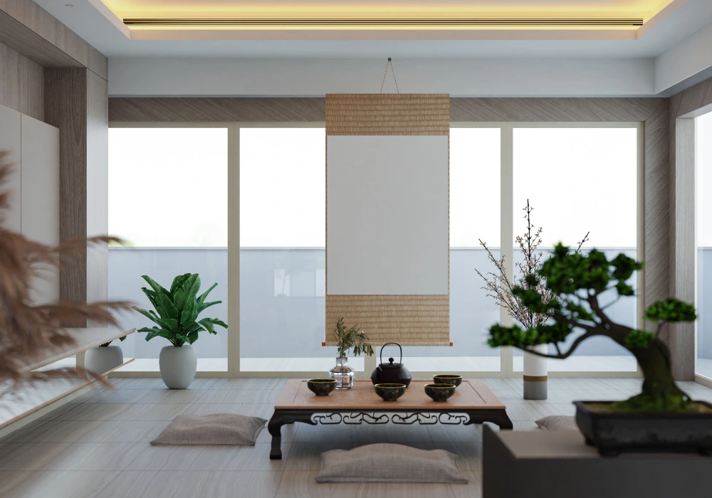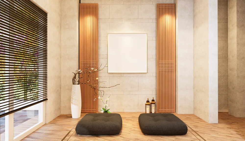 Em uma casa de campo, um espaço zen pode ser em uma varanda fechada, aproveitando a vista para o jardim. Móveis planejados em bambu são utilizados para harmonizar com o ambiente natural: um tatame cobre o chão, proporcionando uma base confortável para a prática de meditação e nichos embutidos nas paredes armazenam incensos e livros sobre mindfulness.
