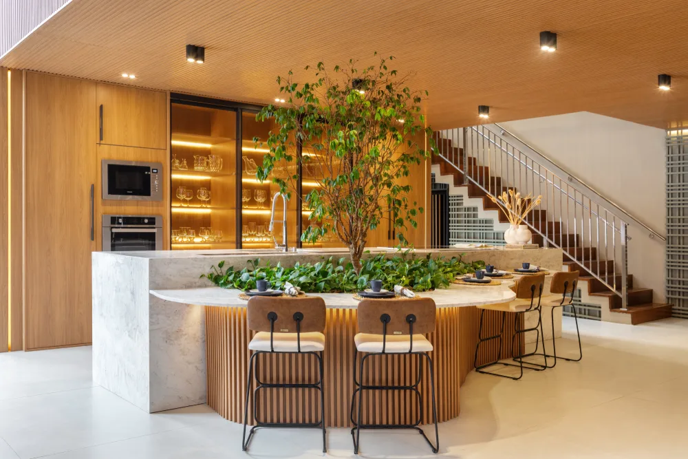 • Sustentabilidade: materiais como quartzito reciclado e madeira de reflorestamento estão em alta, oferecendo opções ecológicas e duráveis para projetos responsáveis.