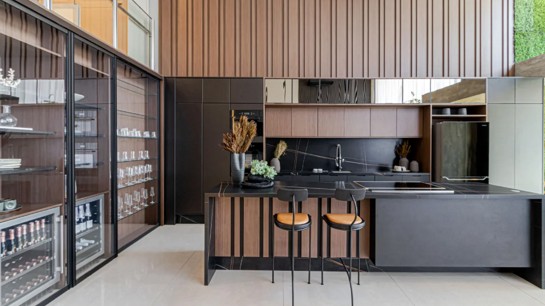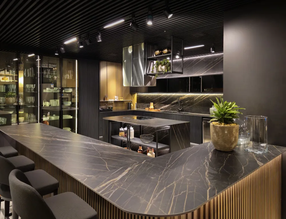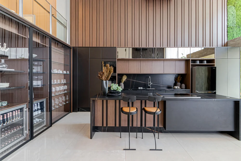 • Bancadas com revestimentos tecnológicos: materiais inovadores, como porcelanato ultracompacto e Nanoglass, oferecem alta resistência, durabilidade e baixa porosidade, tornando a limpeza mais fácil e aumentando a vida útil da bancada.